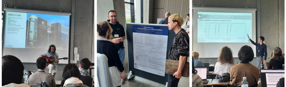 Dr. Mauro Orsini Windholz presented his research on “Conventional and characteristic harmonic sequences across Brazilian choro, Western classical music, and rock,” even picking up the guitar himself. Lucas Hofmann presented a new theoretical framework and quantitative analyses on metric complexity in Hugo Distler's motets. A new formula makes it possible to compare two pieces of music in terms of their metric complexity. Adrian Nachtwey and Tim Eipert presented a poster showcasing the tool “MusicDiffVision,” which enables dynamic visualizations of differences in digital music encodings. In addition, Benjamin Henzel from Prof. Christof Weiß's group (Computational Musicology) presented a poster on “Audio-Based Strategy for Investigating Style Evolution in Western Choral Music”.