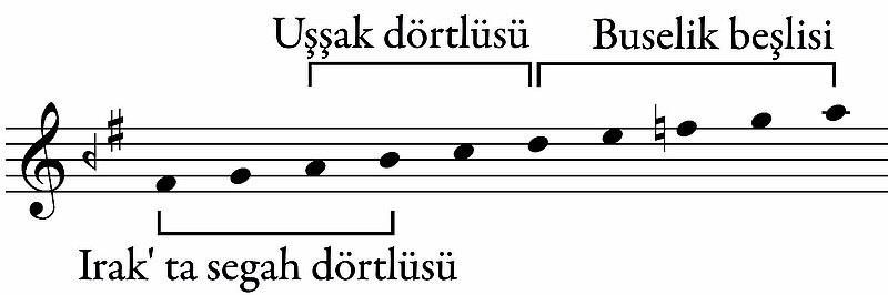 Segâh-Tetrachord (transponiert auf Irak), Uşşak-Tetrachord, Buselîk-Pentachord.