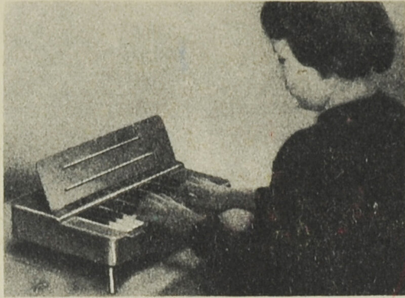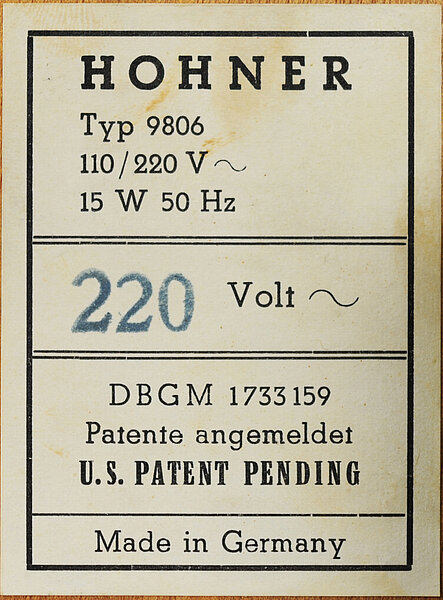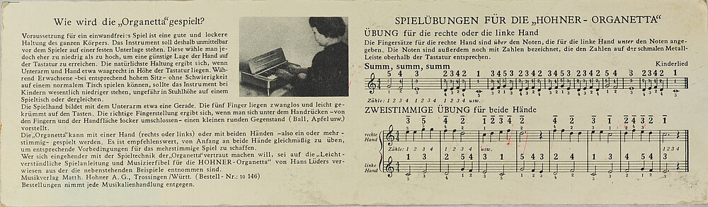 Beim Objekt: (a) Originaler Produkt- bzw. Transportkarton, teilausgekleidet bzw. gepolstert mit grünem Filz. (b) Beidseitig bedruckter Kartonstreifen zum Auflegen auf das Pültchen, auf der einen Seite mit einer Erläuterung des Tonvorrats, auf der anderen mit Spielhinweisen und -übungen sowie einem "Image"-Foto, aus dem das avisierte Zielpublikum (die nichtprofessionell musizierende Hausfrau) erschlossen werden kann.