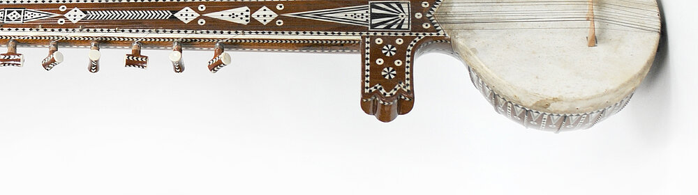 10 Resonanzsaiten (50–30,5 cm) mit seitenständigen Wirbeln in der linken Seite des Halses