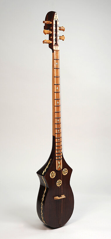 2 Spielsaiten (als Chor) 3 Bordunsaiten 19 Bundstäbe