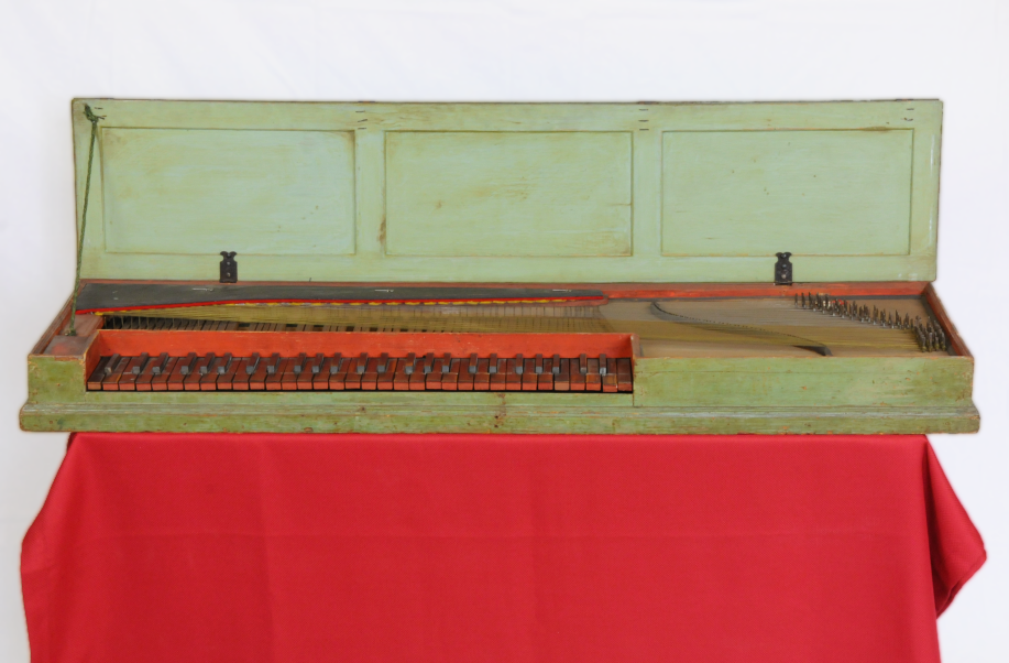 Gesamtlänge: 135,7 cm, Breite: 40,5 cm, Höhe mit Deckel: 12,4 cm. Deckel und Zargenaußenseiten grün bemalt, davon abgesetzt in roter Bemalung die Zargeninnenseiten, Klavierbacken und Werkzeugkasten. Der Rot-grün-Kontrast setzt sich bei den Klavieturbegrenzungsleisten und dem Hirnholz der Hebel fort. Alle Gehäuseteile und Tastenhebel aus Fichte, Untertastenbelag aus gebeizter Pflaume, Obertastenbelag aus gebeizter Birne.
