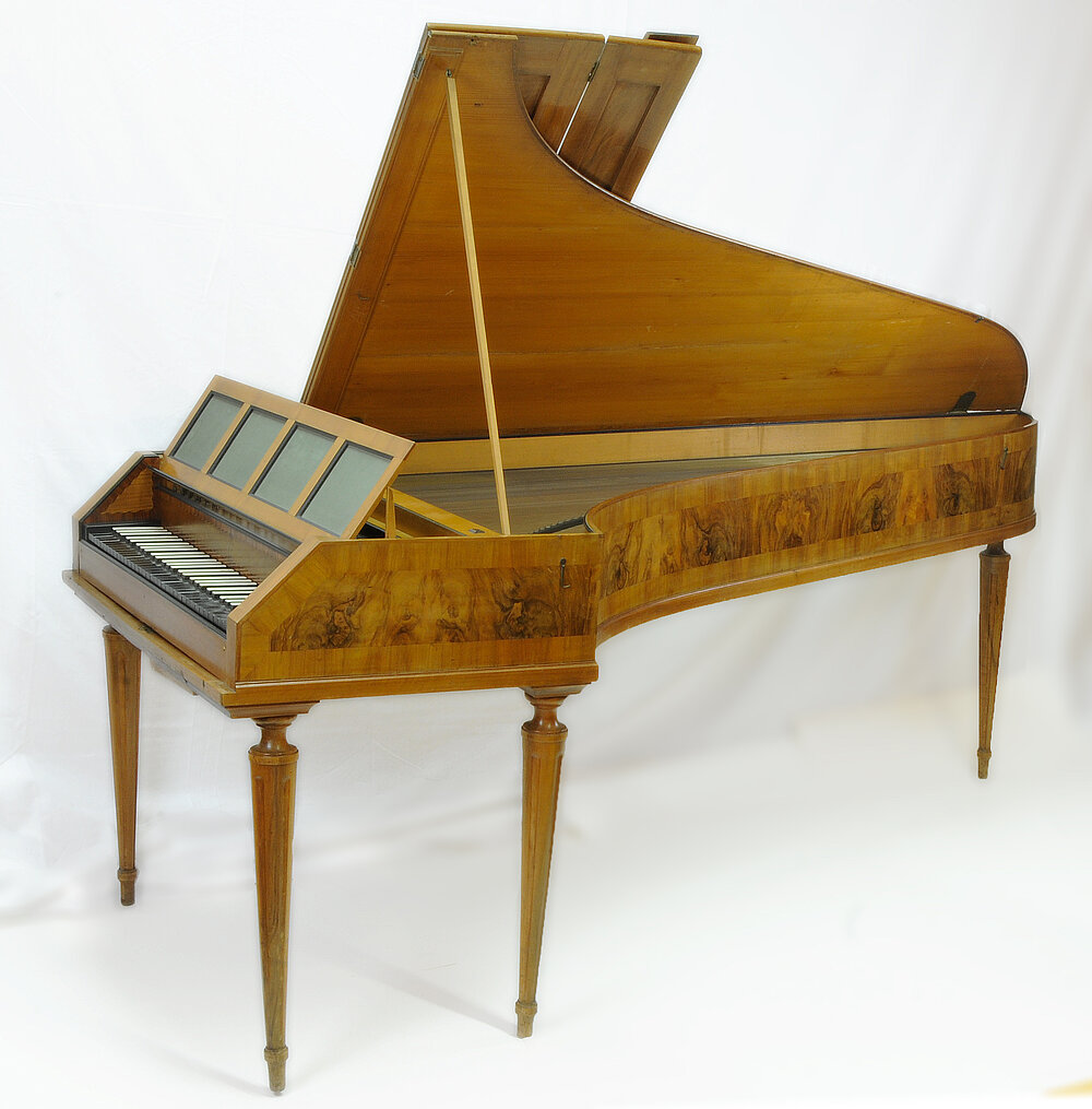 Wiener Prellzungenmechanik (vgl. Standbildvideo unten). Hämmer rückwärts gewendet, Schnäbel aus Birne, Kerne aus durchbohrtem Nussbaum mit Lederschicht. Belederung wahrscheinlich erst später (vgl. Rupprecht 1954, S. 122 und Latcham 2010, S. 152). Birnbaumkapseln durch Eisendraht mit den Tastenhebeln verbunden. Auslöser (Prellzungen aus Birne) mit Lederscharnieren, die zwischen der unteren Kanzellenführungsleiste und einer darauf geschraubten Nussbaumleiste befestigt sind. Messingfedern, in der Auslöserleiste befestigt, auslaufend in Lederpolster an den Zungen. – Hebt sich das hintere Ende der Taste mit der darauf befindlichen Kapsel mit Achse, in der der Hammer aufgehängt ist, verfängt sich dessen hinteres Ende, der Schnabel im Absatz des federnd abgebrachten Auslösers ("Prellzunge"). So wird das vordere Ende gegen die Saite geschleudert. Zugleich hebt die Dämpferpuppe den darüber befindlichen Dämpfer von der Saite ab. Nach dem Anschlag fällt der Hammerkopf zurück auf den Fänger (rote Filzrollen).