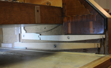 Stimmstock aus Eiche mit Ahornauflage. Stärke 5,3 cm, Tiefe konstant 19 cm. Vor den Wirbeln sind mit Tinte Saitenstärkennummern notiert (siehe Bild). Steg aus schwarz gebeiztem Obstholz, Höhe (Bass bis Diskant) 1–0,95 cm. Anhängeleiste entlang der geschweiften Hohlwand aus schwarz gebeiztem Nussbaum, Höhe (Bass bis Diskant) 1,11–0,72 cm.