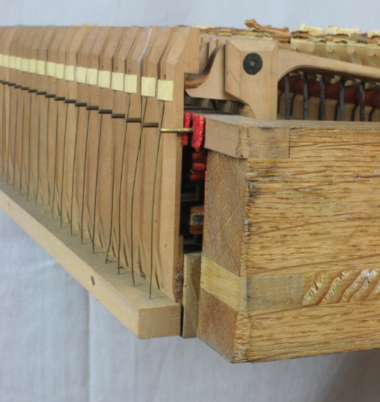 Klaviatur: Schwarz gebeizter Birnbaum für Backen und Obertasten, Knochenauflage bei den Obertasten; Untertasten mit Ebenholzauflage, Stirnkanten aus schwarz gebeizter Birne. Tastenhebel aus Fichte, Auflageböckchen aus Ahorn. Eingelassener Lederbelag an den Rückenenden der Hebel. Tastentiefgang ca. 0,55 cm. Tastenführung über Kanzellen (Messingstäbchen zwischen zwei Nussbaumleisten). Klaviaturrahmen aus Fichte, der die Klaviatur mit Mechanik erhöhende Schlitten aus Fichte, mit Seitenleisten aus Eiche.