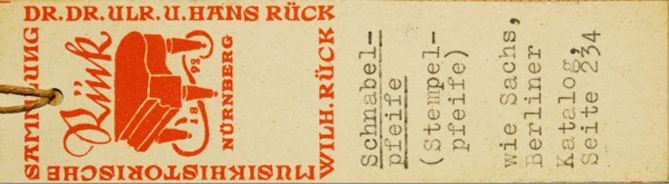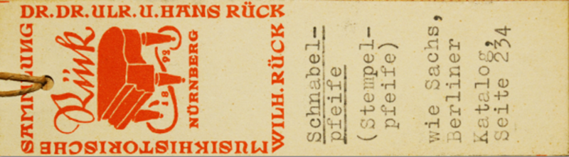 Literatur: Curt Sachs: Sammlung alter Musikinstrumente bei der Staatlichen Hochschule für Musik zu Berlin, beschreibender Katalog, Berlin 1922,  234. – Renate Huber: Verzeichnis sämtlicher Musikinstrumente am Germanischen Nationalmuseum Nürnberg, Wilhelmshaven 1989, 200. – Thomas Jürgen Eschler: Die Sammlung historischer Musikinstrumente des Musikwissenschaftlichen Instituts der Universität Erlangen-Nürnberg, Wilhelmshaven: Florian Noetzel 1993, 35.
