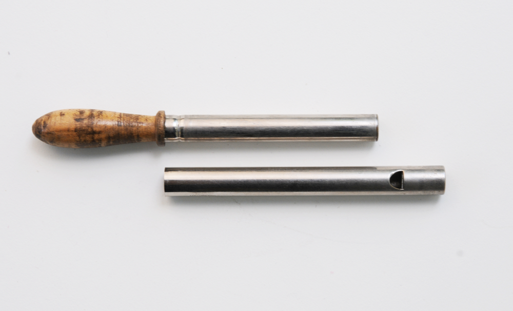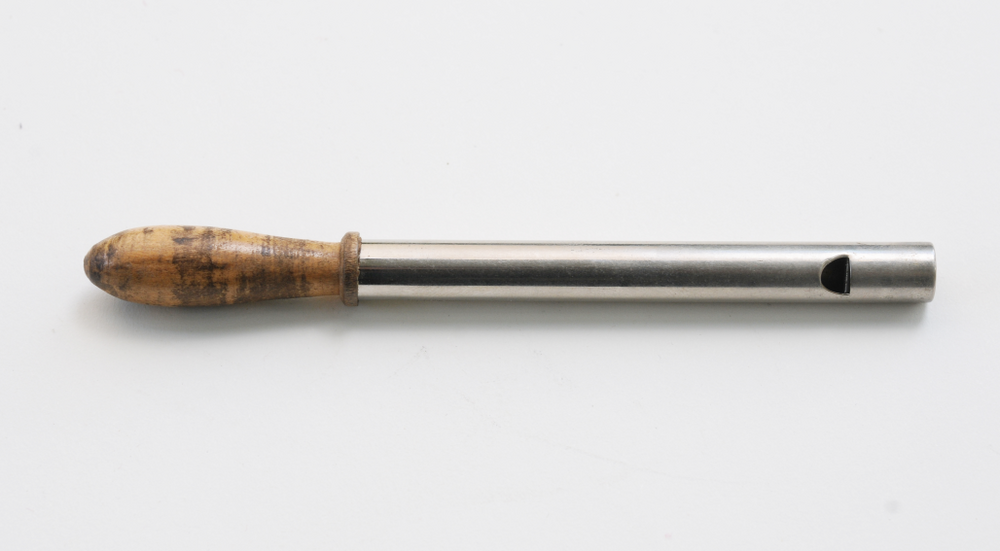 R 22: Pfeife, 1950er Jahre. Rohr und Stempel aus verchromtem Blech mit zylindrischem Kanal, Schlagstempel auf der Rohrachse zur Stempelöffnung hin: MADE IN GERMANY. Anstelle eines Kerns findet sich ein ins Rohr eingesetztes, geknicktes Stück Blech, ca. 3° in Anblasrichtung abfallend, Fenster halboval, schräg max. 1,5 mm tief eingeschnitten (gesägt/gefräst?, spielerseitig rechts, leicht unregelmäßig, Breite 0,5 cm, max. Höhe 0,4 cm). Rohrabschluss per Stanzung nach innen gebogen. Stempel ohne Tonhöhenmarkierungen, Länge ohne Griff 6,4 cm. Stempelabschluss konkav. Griff aus Ahorn, klar lackiert, abgetragen, verschmutzt. Tiefster spielbarer Ton d2, ohne Überblasen erreichbar ca. g3, höchster d4 (überblasen). – Gesamtlänge 12,4 cm, Labiumkante bis Rohrende 7 cm, Rohrdurchmesser 0,84 cm.