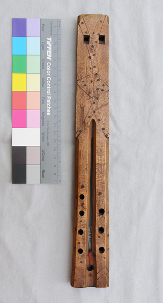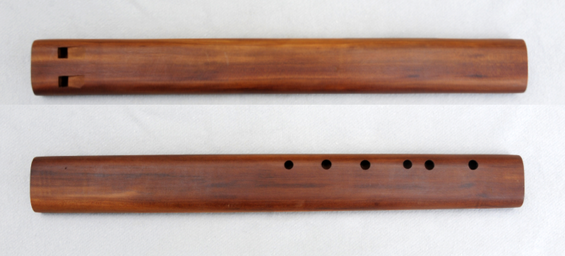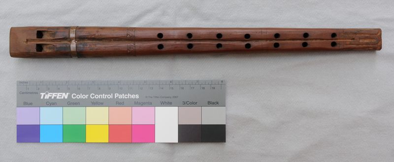 Ein Stück Zwetschge, 5 mm breites, auf der Rückseite zusammengelötetes Messingband 5,8 cm vom Anblasende, 7 mm breites eingeritztes Bandornament 11,1 cm vom Anblasende entfernt. Länge 35,3 cm, Breite 3–2,1 cm, Labiumkante bis Austritt (beide Pfeifen) 32,1 cm.