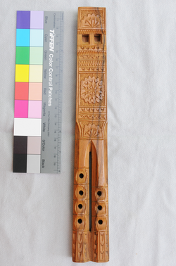 kroatisch, 1980er Jahre (?). Aus einem Stück Ahorn, Länge 30,8 cm, Breite 3,5–4,5 cm, Labiumkante bis Austritt links 26,7 rechts 26,5 cm. Labiumkante rechteckig. Kanäle gebohrt, 11 mm. Standardisierte Reliefschnitzerei mit Bändern und Rosettenmustern. In Masse gefertigt. Drei Grifflöcher links, vier rechts, alle senkrecht zur Rohrachse gebohrt.