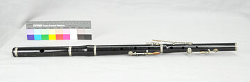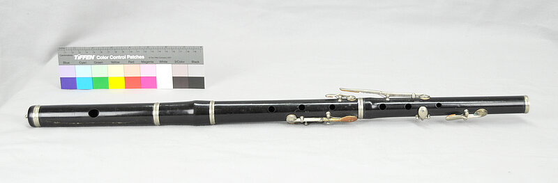Rohr aus Ebenholz, 4-teilig. Bohrungsverlauf zum Fuß hin konisch abnehmend. Kopfteil innen Messingrohr.