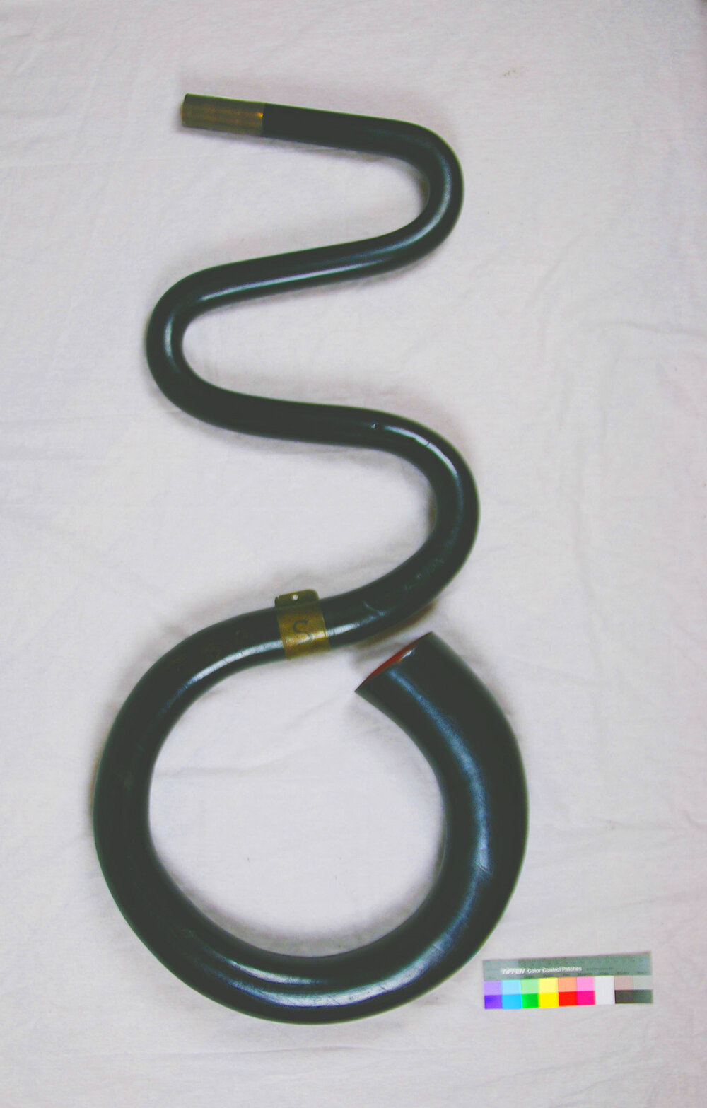 Rohr aus Nussbaum, außen schwarz gebeizt. In einer Ebene drei u-förmige Windungen und eine kreisförmige Windung. Zwei Hälften in Richtung zur Rohrachse, ausgehöhlt und zusammengeleint, der Rohrvelauf ist durchgehend konisch, ohne Erweiterung am Schallende. Das Rohr hat keinen Lederüberzug. Eine Hülse aus Messing, zu Beginn der kreisförmigen Windung mit zusammengelöteten Rändern. Darauf die Signatur und an  den Rändern je eine eingedrehte Ringlinie. Sechs Grifflöcher, 1–3 kurz vor der Mitte der driten U-förmigen Krümmung für Finger (links 2–4); Grifflöcher 4–6 zu Beginn der kreisförmigen Windung für Finger (rechts 2–4). Stürze innen rot angestrichen. Mundstück nach Angabe von Eschler (1993) modern (Maße folgen). Eschler nimmt Kontra-B als Grunton an (nicht verifiziert).