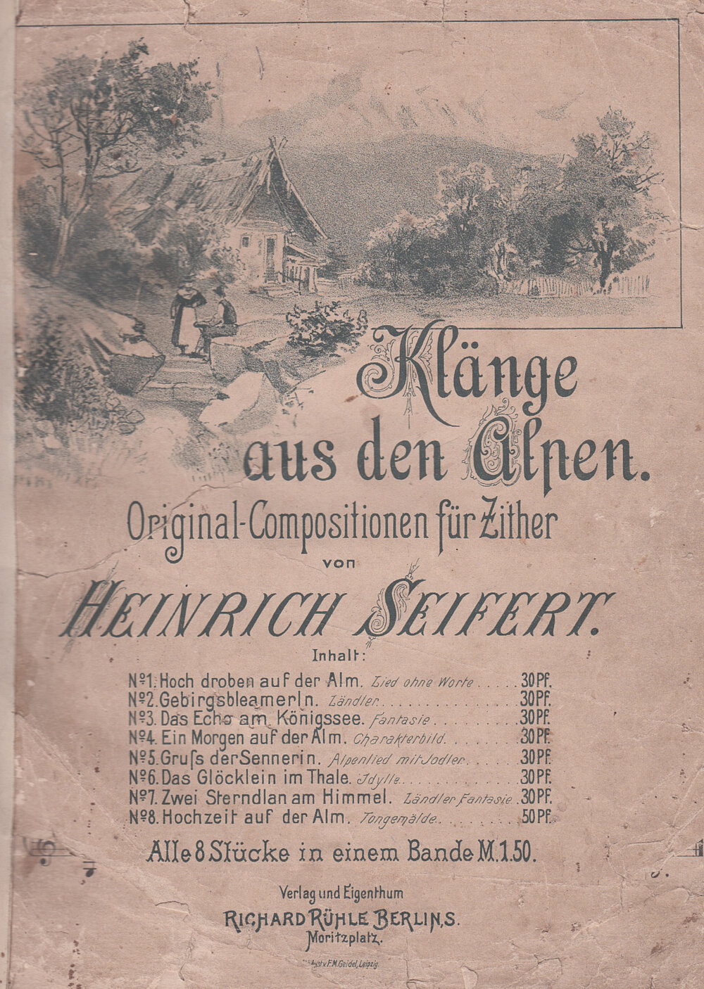 Zubehör: aufklappbarer Tischnotenständer aus Metall. Stimmpfeife, Stimmkrücke, Saitenzange, Saitenrolle mit Kupferdraht, vier Zitherringe.