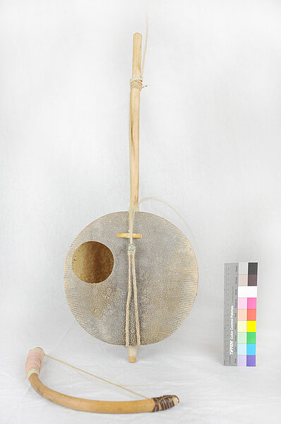 Membranbespannung aus Waranhaut, geleimt und mit kurzen Nägeln fixiert.