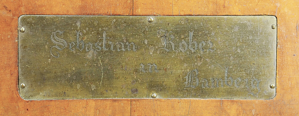 Das Messingschild am Vorsatzbrett mit gravierter Inschrift lautet: "Sebastian Kober // in // Bamberg". Eschler (1993) hält das Schild für das nachträglich ausgetauschte Schild des Verkäufers. Kober war Instrumentenbauer in Bamberg. Eine Autorschaft für das Instrument ist nicht ausgeschlossen.