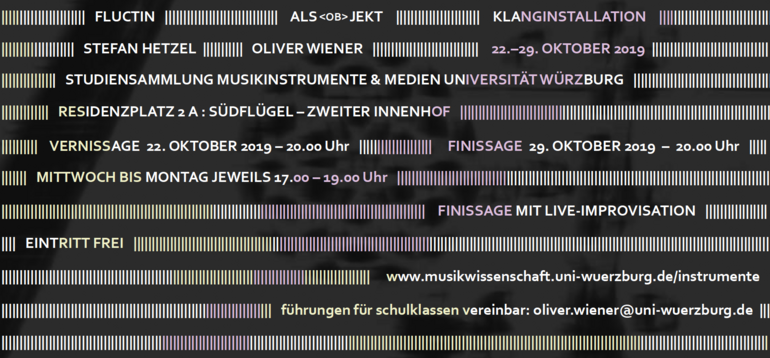 Der binnengeklammerte Titel beschreibt die Konzeption der Klanginstallation: das Lavieren auf der Grenze zwischen objekthafter Stabilität des wahrgenommenen Klangs und einer Täuschung solch objekthafter Wahrnehmung. Mancher Klang verbindet sich mit den in der Studiensammlung Musikinstrumente & Medien ausgestellten Instrumenten konkret, mancher schält sich aufgrund seiner digitalen Bearbeitung, mal ‚atmosphärisch‘, mal skurril, vom sichtbaren Musikmobiliar ab. Das Klangmaterial von als<ob>jekt bilden ca. 2000 Samples, die aus Aufnahmen von Instrumenten der Sammlung präpariert wurden. Unter Zugabe eines reichlichen Zufallsfaktors wurden sie mit der Software Pure Data zu unterschiedlichen Texturen verwebt.
