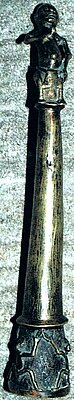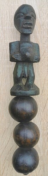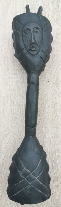 Rassel 2 besteht aus zwei Teilen: einer männlichen Figur und drei runden, hohlen Kugelelementen bei denen es sich um kleine Kalebassen handeln könnte. Die geschnitzte Figur hält mit beiden Händen einen halbrund-kegelförmigen Gegenstand vor der Brust und steht auf einer runden Scheibe. Ein 11 cm langer Holzstab geht von deren Mitte aus nach unten und  durchbohrt die drei hohlen Kugeln, die mit kleinen Rasselelementen gefüllt sind. Ein Querhölzchen am Ende des Stabes verhindert ein Herausrutschen der lose beweglichen Kugeln. Beim Schütteln entsteht ein relativ leises und weiches Geräusch. Ich vermute, dass es sichhier um ein Kinderspielzeug handeln könnte.