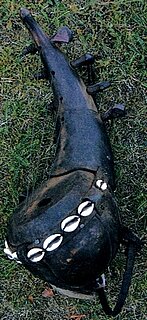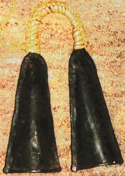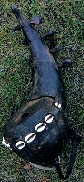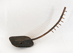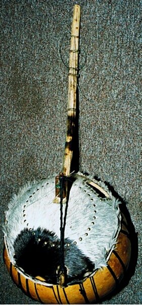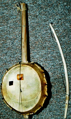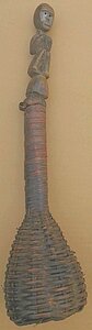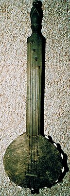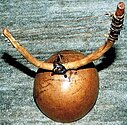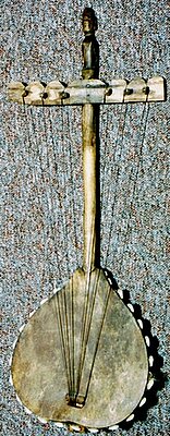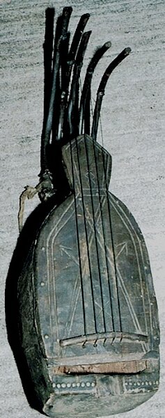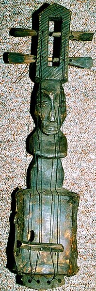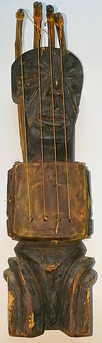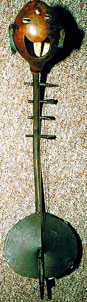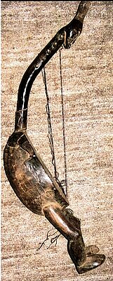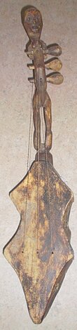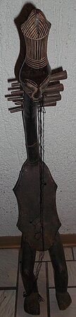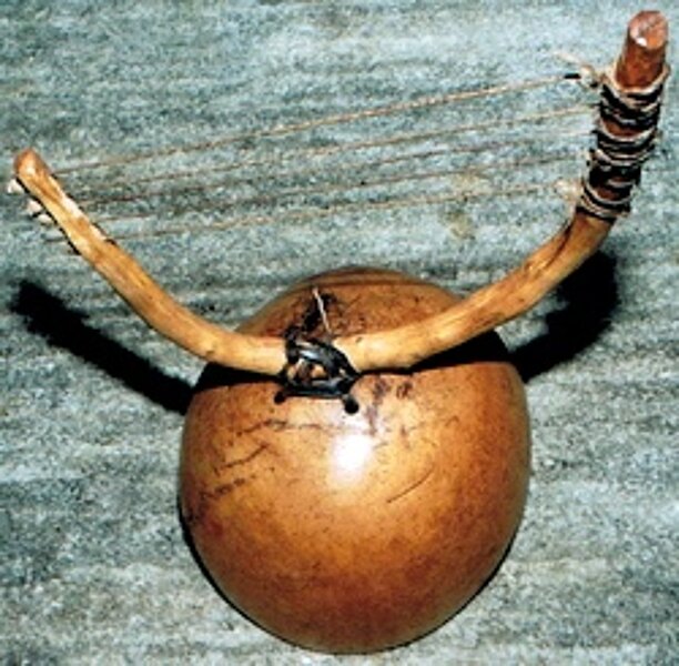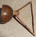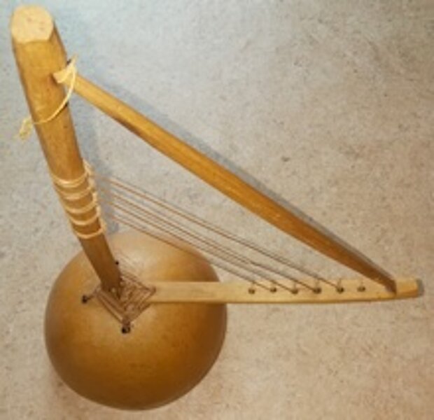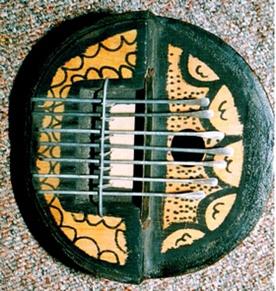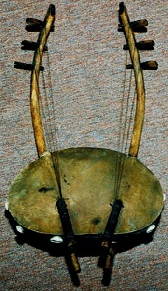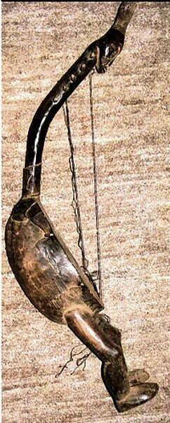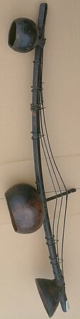 Bei dem rechten der beiden abgebildeten Instrumente bin ich mir nicht sicher, ob es sich lediglich um eine verkleinerte Variante einer Kora handelt, oder ob es eine der oben angesprochenen Varianten von verschiedenen Stegharfen darstellt. Der Korpus besteht aus einer Kalebasse, die mit einer Lederhaut bespannt ist. Über den aufrechten Kerbsteg verlaufen sechs Saiten, die am Hals festgebunden sind und hinter dem Steg zu einem Strang zusammengefasst werden, der am Korpus bzw. am überstehenden Teil der Stange befestigt wird. Greifstäbe und Hals sind am Ende mit Kaorimuscheln verziert, die drei Gesichter symbolisieren.