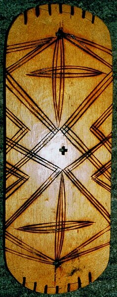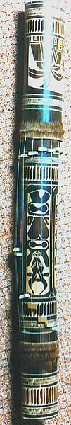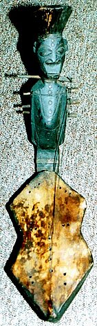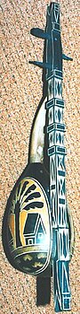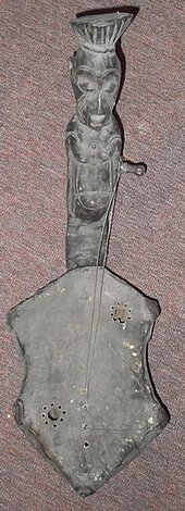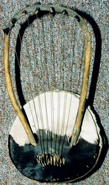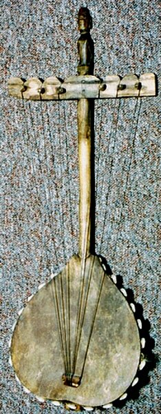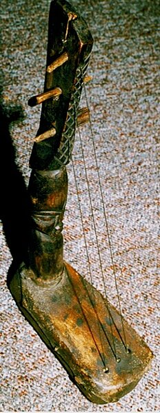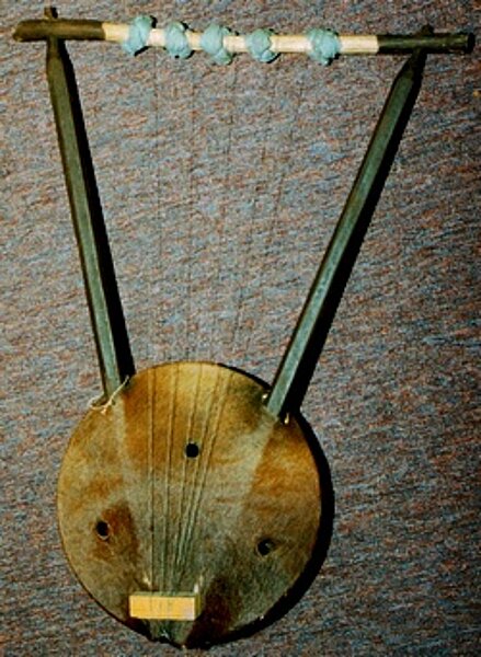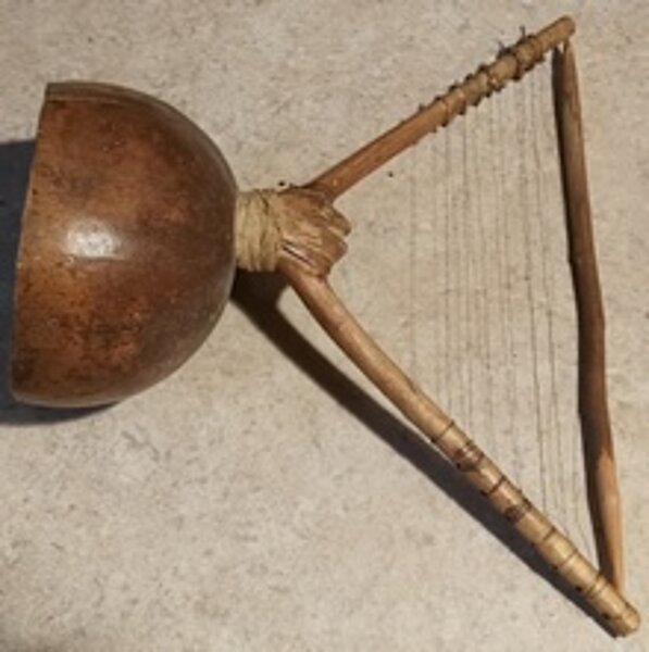 Die beiden anderen Instrumente möchte ich als Hybridinstrumente bezeichnen, weil sie sowohl Kennzeichen von Harfen als auch von Lauten besitzen. Das erste Instrument besteht aus einer annähernd runden Kalebasse als Resonator. Darüber ist ein Fell gespannt, welches von 13 Holzpflöcken gehalten wird. In den Rand des Fells sind kleine Schlaufen eingeschnitten, welche über die Pflöcke geschlungen sind und die Membranhaut straff halten. Die Bogenstange verläuft in einer leicht geschwungenen S-Form und tritt dann fast in einem rechten Winkel in die Kalebasse ein. Die Eintrittsstelle ist mit einer harzartigen Masse verklebt. Am gegenüberliegenden Rand des Resonators befindet sich in etwa gleiche Höhe ebenfalls eine Klebestelle, so dass ich vermute, dass der Stab ähnlich wie bei einer Spießlaute durch den Korpus geführt wird. Aus der Bogenstange ist eine männlichen Figur herausgearbeitet über der das Ende der Stange mit den vier Wirbeln ebenfalls dekorativ mit Mustern beschnitzt ist. Die Wirbel sind paarig angeordnet, zwei von der linken und zwei von der rechten Seite. Die Saiten treten aus Löchern aus, die von vorn in den Stab zu den Wirbeln gebohrt sind. Von dort gehen sie zu einer Querleiste unter dem Fell. Sie verlaufen im gleichen Abstand zueinander parallel zur Membrandecke. Dieses Kennzeichen ist aber signifikant für Lauteninstrumente.