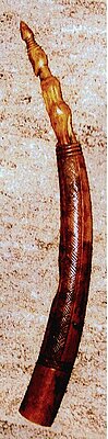 Viele der Instrumente werden oft dekorativ mit geometrischen Motiven verziert und anthropomorph ausgestaltet, wie im linken Beispiel zu sehen ist. Die Hornspitze besteht hier aus einer fein herausgeschnitzten Frauenfigur während am sich erweiternden Teil geometrische Muster eingeritzt sind. Es scheint sich um ein Antilopenhorn zu handeln. Auch bei der Bronzetrompete ist das eine Ende als menschliche Figur gegossen, während die Stürze ebenfalls halbplastische Gestalten zeigt. Beide Instrumente verfügen über ein längliches Blasloch, über den Anblaswinkel lässt sich die Tonhöhe in geringem Umfang beeinflussen. Bei drei Vierteln aller Horntrompeten ist die Spitze des Horns abgeschnitten. Man kann sie mit dem Daumen verschließen und damit wie bei dem Einsatz eines Ventils einen zweiten Ton produzieren, außerdem besteht noch die Möglichkeit des Überblasens. Gerade beim Aussenden von Signalen werden dadurch die Gestaltungsmöglichkeiten entscheidend erweitert. Bei manchen Instrumenten benutzt man gerollte Bananenblätter zur Vergrößerung des Schalltrichters und zur Verstärkung des Klangs, bei anderen werden direkt Holztrichter mit Hautstreifen festgebunden. Um die Bedeutung des Instruments zu steigern, werden sie manchmal mit Leoparden- oder Schlangenhaut überzogen. [412] [413]