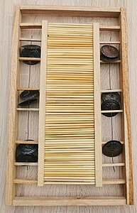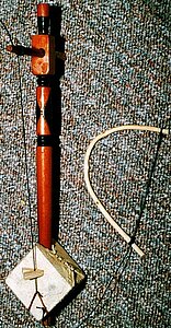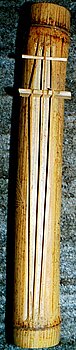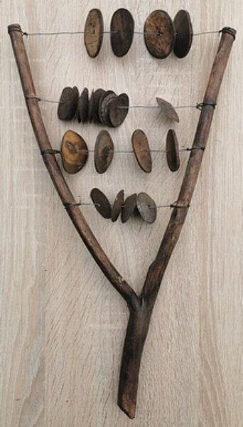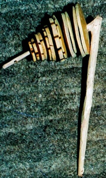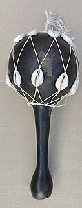Das rechts danebenstehende Instrument wurde vom Verkäufer wohl lautmalerisch als rakata bezeichnet. Auch hier handelt es sich um eine Art Sistrum, allerdings aus dem dafür seltener verwendeten Material Holz. Es besteht aus einer Astverzweigung  einer hellen Holzart. Von dem dickeren Teil, der als Griff dient, zweigt im Winkel nach unten ein dünnerer Ast ab. Auf ihm sitzen zwölf zentrisch dorchbohrte Holzscheiben mit einem abnehmenden Durchmesser von 7,5 bis 3 cm. Beim Schütteln schlagen sie einerseis auf einen durch den dünneren Teil geschlagenen Holzstift, andererseits gegen den Griff.