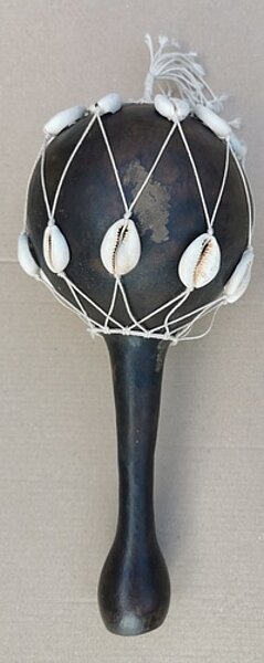 Rassel 3 stellt eine kugelförmige Gefäßrassel dar. Sie besteht aus einer runden, hohlen Kalebasse mit einem länglichen Fortsatz, der als Griff dient. Als Rasselelemente dienen eine Anzahl von Kaorimuscheln, die an den Knotenpunkten eines Netzes locker auf der Außenhaut des runden Kalebassenteils liegen. Beim Schütteln schlagen die Muscheln von außen auf den Hohlkörper und verursachen ein typisches Geräusch.