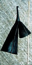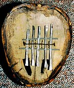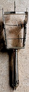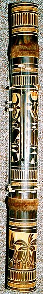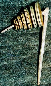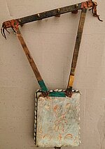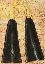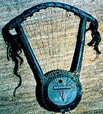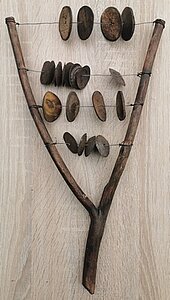 Die Basis für das einfache Sistrum daneben ist eine Astgabel. Von einem Zweig zum anderen sind im Abstand von 6, 5 und 8 cm Eisendrähte unterschiedlicher Länge gespannt, deren Verrutschen durch Einkerbungen im Holz verhindert wird. Auf dem kürzesten, unteren Draht sitzen vier dünne, runde Eisenplättchen, die mittig durchbohrt sind. Sie sind leicht gewölbt bei einem Durchmesser von 3,5 cm. Wie beim Becken eines Schlagzeugs sind sie in Paaren mit der konkaven Seite einander zugewendet. Auf dem nächst längeren Draht darüber sitzen vier sehr leichte, runde Scheiben mit einem Durchmesser von 5 cm. Diese könnten aus Scheiben von geschnittenem und getrocknetem Obst oder Früchten bestehen. Auf dem dritten Draht von unten her gesehen befinden sich wiederum, wie auf dem ersten, zehn Metallscheiben, ebenso paarweise wie bei einem Becken einander zugeordnet. Auf dem obersten, längsten Draht sitzen ebenfalls wie auf dem zweiten wieder vier Scheiben des dünnen holz- oder fruchtartigen Materials.