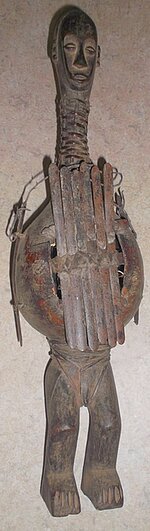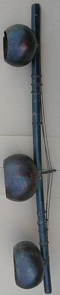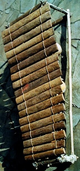 balafone mit Kürbisresonatoren werden überwiegend in Westafrika gebaut. Diese Resonatoren sind in der Größe entsprechend den jeweiligen Stäben abgestuft. In vielen Fällen wird in die Resonatoren noch ein Loch geschnitten, welches wiederum mit einem festen Spinnennetz, Fledermausflügeln oder einfach Papier bedeckt wird. Die Resonatoren wirken dann wie ein Mirliton und erzeugen zusätzlich einen typischen Klang. Das balafon ist das dritte wichtige Instrument (nach dem ngoni und der kora), welches von den jelis in Westafrika zur Begleitung ihres Gesanges benutzt wird. Typisch ist auch, dass die Platten in einem Gestell aus Holzstäben befestigt sind, die mit Lederriemen und Schnüren zusammengehalten werden. Ein Verschieben der Platten wird durch eine umgewundene Schnur verhindert. Das abgebildete Balafon 1 hat 18, Balafon 2 hat 16 Klangstäbe. [389][390][391]