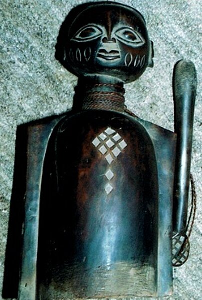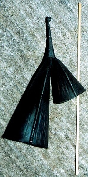 Ähnliche Aufgaben vermögen auch Holzglocken zu erfüllen. Sie zeigen häufig schöne Verzierungen und werden auch öfters anthropomorph ausgestaltet wie im nebenstehenden Beispiel ersichtlich wird. Hölzerne Doppelglocken sind eher selten anzutreffen. Mit Ausnahme der vier Klöppelelemente ist das nebenstehende Schüttelidiophon aus einem Stück von dunklem, leichtem Holz geschnitzt. Es besteht aus zwei ovalen, dünnwandigen, becherförmigen Glocken, die durch einen Stiel miteinander verbunden sind. Die obere Glocke ist etwa 10 cm hoch und hat eine ovale maximale Öffnung von 7 cm. Ein geschnitztes Gesicht nimmt den größten Teil der einen Seite nach vorne ein. Von ihm gehen Kerben zu zwei seitlichen, wellenförmigen Verzierungen aus. Auf der Rückseite finden sich lediglich zwei längs- und vier schräg verlaufende Kerbungen. Von außen sind zwei Löcher gebohrt, durch die eine dünne Schnur geführt ist, die wiederum durch zwei ca. 11 cm lange, halbrunde Holzstäbchen verläuft, die beim Schütteln von innen gegen die dünne Wand der Glocke schlagen. Die untere Glocke ist einfacher gestaltet und mit je zwei parallelen Kerben versehen, die sich schneiden. Die Konstruktion der Klöppel ist identisch mit der oberen Glocke, allerdings ist die Tonhöhe unterschiedlich und so entsteht beim Schütteln am mittigen Stiel ein Zweiklang.