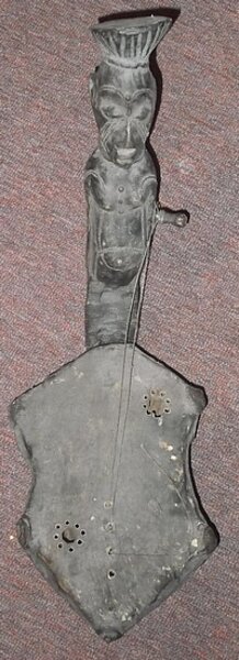 Laute 1 besteht aus einem Kürbisresonator, welcher mit einem Fell bespannt ist. Dieses wird durch ein Band von Kaorimuscheln zusätzlich befestigt. Der Hals ist in Form eines Stabes ausgeführt, welcher den Korpus durchdringt und in seinem Inneren endet. Das Ende des Halses ist als menschliche Figur geschnitzt. Quer zum Hals ist ein rechteckiger Saitenhalter angebracht, dessen oberer Teil in kleinen Rundungen ausgebildet ist. Auf beiden Seiten des Halses sind in den Querbalken je drei einfache, hinterständige Holzwirbel eingelassen, mit denen die sechs Saiten gestimmt werden können. Die Saiten verlaufen über einen kleinen, runden Steg und sind wahrscheinlich an dem Halsstab befestigt, so dass es sich um eine Binnenspießlaute handeln könnte. Über regionale Verbreitung (Ostafrika?) und Spieltechnik habe ich nichts Genaues in Erfahrung bringen können.