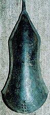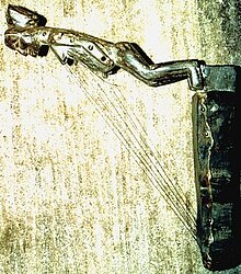 Bei Harfe 11 sind aus dem Hornmaterial zwei Menschen herausgeschnitzt, wobei der obere auf den Schultern des unteren steht, der ihn an den Beinen festhält. Der sich verjüngende Teil des Horns ist auf beiden Seiten gleichmäßig abgeflacht, wahrscheinlich um das Einbohren der Löcher für die Holzwirbel zu erleichtern.