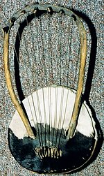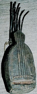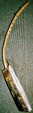 Die nebenstehende ennanga ist eine achtsaitige Bogenharfe des ersten oben beschriebenen Typs, bei dem der Bogen auf dem Körperboden ruht. Sie besitzt eine längliche Form mit abgerundeten Seiten. Der Resonator ist mit Leder bespannt; die Deckenmembran wird dabei mit einem zweiten Stück, das auch den Korpus von unten umschließt, mit Riemen verschnürt. In die Decke sind zwei relativ große, runde Löcher eingeschnitten, durch die man erforderliche Reparaturen ausführen kann. Die Saiten werden unter der Decke, die aus der Haut von Säugetieren, aber auch aus Eidechsen- oder Schlangenhaut bestehen kann, an einer Holzleiste als Halterung befestigt. Die Spannung der Saiten zwischen Leiste und eingelegtem Halsbogen gibt dem Instrument die notwendige Stabilität. Die Saiten sind äquipentatonisch gestimmt, dh. die Oktave wird in etwa fünf gleich große Stufen unterteilt. Drei Töne erklingen dadurch in der Oktav. Die Harfe wird beim Spiel zwischen den Beinen gehalten, der Bogen zeigt weg vom Körper des Spielers, der rechte Daumen und der rechte Zeigefinger spielen die Hauptmelodie, okunaga genannt, der linke Daumen und der linke Zeigefinger spielen eine Gegenmelodie okwawula in einem ineinandergreifenden, verzahnten Stil (interlocking ).[359]
