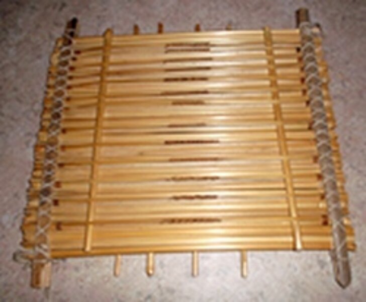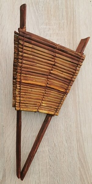 Bei Rassel 4 handelt es sich ebenfalls um eine Korbrassel. Sie besitzt die Form eines trapezoiden Kastens. Zwei dünne, flache Leisten aus Holz werden in einem Abstand von 14 cm mit zwei 7 und 14 cm langen Leisten mit gleicher Breite durch Schnüre miteinander verbunden, so dass ein Kasten ohne Boden und Decke entsteht. Durch das Aufbinden und Verschnüren von Pflanzenstängeln von unten und oben entsteht ein geschlossener Raum, in den zuvor kleine Rasselelemente eingefüllt wurden. Die Stängel haben eine äußere, feste Hülle, während ihr Inneres aus einem holundermarkartigem Material besteht.