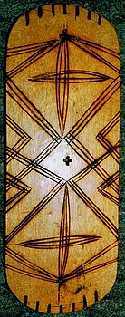 Eine ähnliche Konstruktion, was die Saitenbefestigung anbelangt, weist die unten zu sehende Harfe 10 auf. Ihr Resonator ist kreisrund und wird auf Ober- und Unterseite jeweils von einem Fell bespannt. Beide sind an den Rändern perforiert und fest miteinander verschnürt. Ebenso wie bei Laute 12 scheint es sich wohl um Kinder- oder Touristeninstrumente zu handeln. Harfe 12 hat eine Saitenaufhängung ähnlich wie 9 und 10, ihr hervorstechendes Merkmal ist der auf das Halsende aufgesetzte Kopf. Dieser besteht aus einer kleinen Kalebasse, aus der der Mund ausgeschnitten ist, während Kaorimuscheln die Augen bilden.