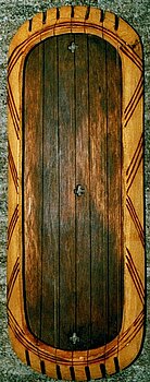 Bei der nebenstehenden Krar 3 sind Wirbel, Saiten und Steg von mir ergänzt worden. Sie besetzt ein schräg stehendes Joch mit vier Bohrungen zur Aufnahme der Wirbel und Lederriemchen mit eingebundenen Kaorimuscheln als Schmuck. Ebenso sind auf den Rückseiten der beiden Jocharme je drei Muscheln aufgebracht. Der Resonatorkasten ist mittig umlaufend ebenfalls mit aufgenagelten Muscheln als Trennung zwischen Decke und Bodenteil verziert. Die Decke besteht aus einem pergamentähnlichen Material oder Kunststoff mit Resten einer Bemalung in orange-roter Farbe. Zu erkennen sind noch Teile einer umlaufenden Linie als geschwungene Girlande, 4 Halbmonde in den Ecken, zentral eine Blüte mit 8 Blüenblättern, darüber eine Hand mit fünf Fingern. Der rückseitige Boden ist mit einem weichen leder- oder stoffartigen Material überzogen. In der Mitte ist ein kreisrunder Spiegel angebracht, der mit einem Kranz aus Kaorimuscheln besetzt ist, die von Ziernägeln mit runden Köpfen gehalten werden. Dies erscheint dem Betrachter wie eine Blume. Der Spiegel könnte zur Abwehr böser Geister gedacht gewesen sein.
