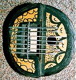 Der längliche, ovale Korpus besteht wahrscheinlich aus Holz. Er ist vollkommen von einer sehr rauen Reptilienhaut bedeckt, vermutlich von einer sehr großen Schlange. Diese Haut scheint verleimt zu sein, ist aber an vielen Stellen durch kleine Eisennägel zusätzlich mit dem formgebenden inneren hölzernen Resonatorteil verbunden. In die Decke sind zwei fast runde Öffnungen eingeschnitten.