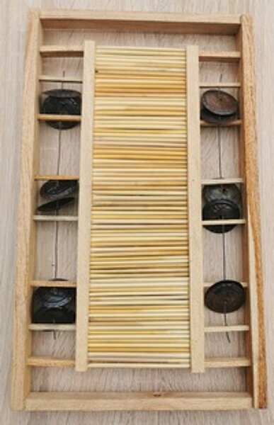Zusätzlich wird ein steifer Stahldraht durch die Querstreben geführt, die zwischen dem inneren Resonatorkasten und dem äußeren Rahmen auf beiden Seiten 4 cm frei liegen. Auf jeder Seite werden auf die Drähte drei Doppelpaare von dünnen Metallplättchen wie beim Becken eines Schlagzeugs angebracht. Sie verursachen einen Effekt wie ein Sistrum oder der Schellenkranz eines Tamburins.