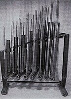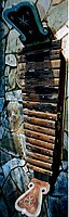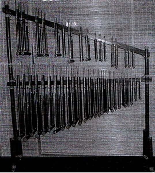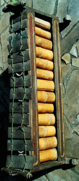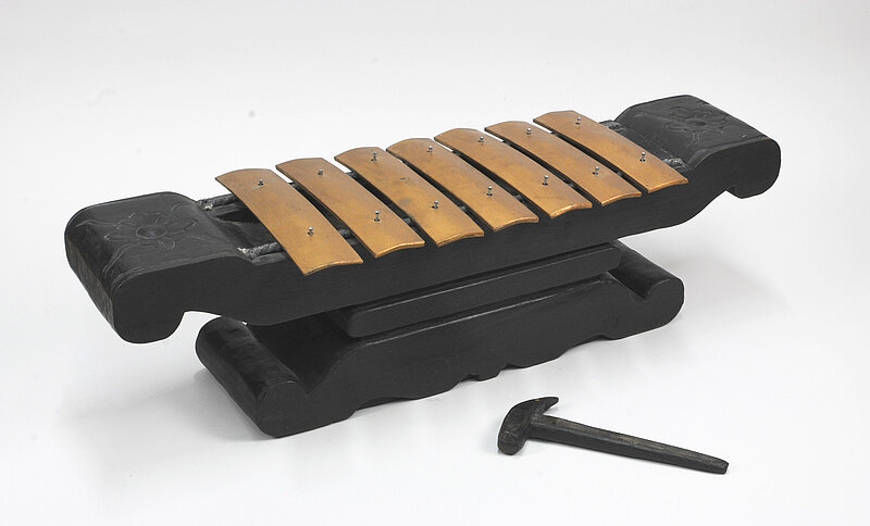 Das hier abgebildete Instrument besteht aus 12 rechteckigen Steinplatten, die diatonisch von c aufwärts bis g gestimmt sind. Sie sind zwischen 20 und 11,5 cm lang, von 1,9 bis 1,4 cm breit und zwischen 0,6 und etwa 0,8 cm dick. Sie sind mit Schnüren gefasst und werden mit deren Schlaufen in einem kleinen, dreiteiligen Holzgestell als Träger aufgehängt. Dieses ist allerdings nicht brauchbar gewesen, weil es keinerlei Stabilität aufwies und das Instrument ständig kippte. Ich habe deshalb al gusto einen stabileren Träger angefertigt um das Instrument spielfähig zu machen. Angeschlagen werden die Steinplatten mit Hilfe von Schlägeln an deren Ende runde Holzkugeln befestigt sind. [165 A]