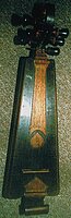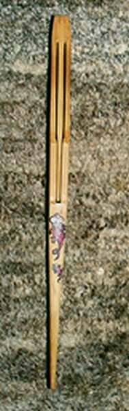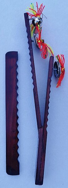 Bei diesem Idiophon sind drei Instrumente in einem zusammengeführt: es kann als Schraper, Rassel oder Klapper dienen. Es besteht aus drei Holzstreifen, von denen zwei miteinander verbunden, aber gegeneinander beweglich sind und beim Gegenschlag als Klapper fungieren. Auf beiden Streifen sitzen Schrauben, die jeweils lose mit zwei Metallscheiben (früher Münzen) bestückt sind. Diese sind mittig durchbohrt und dienen bei jeder Bewegung als Rassel. Der längere Teil besitzt zusätzlich eine metallene hohle Glocke am oberen Ende (Kugel in der Glocke fehlt). Der dritte, separate Holzstreifen besitzt eine gewellte Kante und kann mit den ebenfalls gewellten Ober- bzw. Unterseiten der Klapper als Schraper benutzt werden. An den Rasseln sind rote und gelbe Wollfäden als Verzierung festgeknotet. Die Holzstreifen sind aus einem rötlichen Hartholz gefertigt, das mit einem Klarlack überzogen wurde.