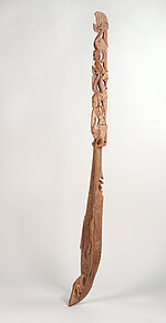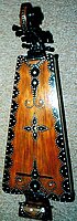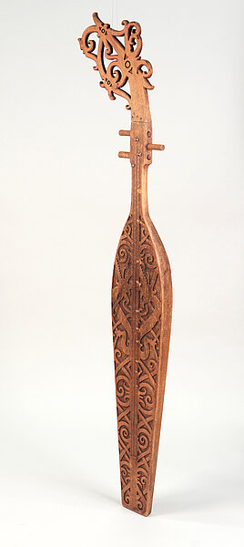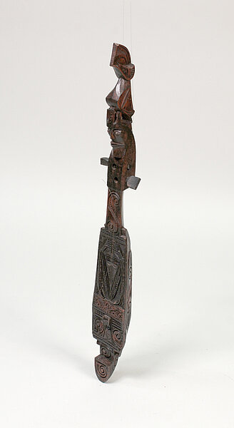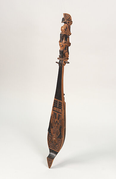 Ungewöhnlich ist vor allem aber die Größe, die die Bataklauten sonst bei weitem nicht erreichen. Ebenso habe ich die Ausprägung des Kopfes, der in Form mehrerer übereinander gesetzter und verschlungener Fabelwesen, die teilweise gehörnt und mit überdimensionalen Augen ausgestattet sind, noch nirgends in der Literatur finden können. Ungewöhnlich ist auch die aufwendig geschnitzte Decke und die Ausgestaltung des Bugsprietes ebenfalls in Form eines stilisierten Kopfes mit großen Augen. Dies könnte zusammen mit der Ausgestaltung des Kopfes ein Hinweis darauf sein, dass es sich um ein Instrument aus der ostindonesischen kutiyapi-Familie handelt. Je nach Region gibt es auch hier eine Reihe lokaler Abwandlungen und unterschiedlicher Bezeichnungen, z.B. kotyapi, fegereng, fuglung, kuglung, faglong oder kusyapi. Auf Sulawesi gibt es eine kacaping, die in ähnlicher Weise dekorativ gestaltet sein soll. Allerdings besitzt diese Gruppe fast immer 5 - 9 einfache Bünde auf dem Griffbrett.