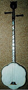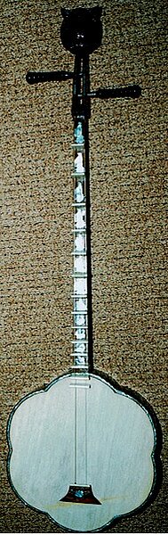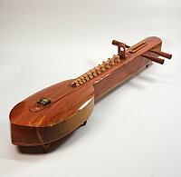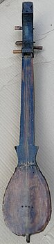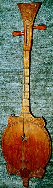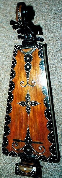 Korpus und Hals bilden eine Einheit, der Boden des Instruments ist mehrfach durch längliche und runde Schallöffnungen durchbrochen. Die Decke ist leicht gerundet, auf ihr stehen 11 hohe Stege und ein größerer "Sattel", über den die drei Saiten verlaufen. Die Position der Stege kann verändert werden und erlaubt das Spiel unterschiedlicher Skalen. Die Saiten werden mit einem länglichen Plektrum aus Hartholz oder beinartigem Material gezupft, Tremolo wird häufig angewendet. Die tiefste Saite ist immer aus Metall, sie wird fast immer als Bordun im solistischen Spiel genutzt. Die beiden höheren Melodiesaiten waren früher aus Darm, werden aber heute auch durch Stahlsaiten ersetzt. Die Stimmung wird mit C g c angegeben.