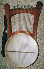 In neuerer Zeit gibt es Bestrebungen, die antiken Instrumente zu rekonstruieren. Das links abgebildete Instrument stammt aus Amerika und wurde vom Verkäufer als "nevel-harp" bezeichnet. Seine Form bezieht sich auf Leiern, wie man sie heute noch in Teilen des östlichen Afrika und des benachbarten arabischen Raums finden kann und deren Korpus mit Fell bespannt ist, sogenannten Membranleiern. Sie zeichnen sich durch ein exotisches Timbre und ein hohes Klangvolumen aus. Das Instrument hat 15 Saiten, welche mit modernen Stimmwirbeln ausgestattet sind, die auf dem Joch sitzen. Ein relativ breiter Steg übertägt die Saitenschwingung auf die Fellmembran.[310][311][312]