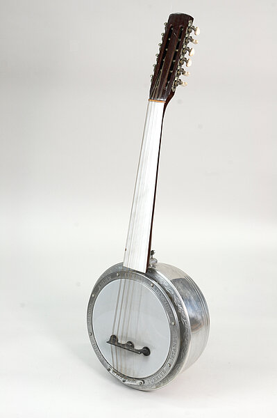 Wie sein Vorläufer hat er einen sehr langen Hals, allerdings ist die Anzahl der Bünde mit 24 auf dem abgebildeten Instrument weitaus geringer als bei seiner gezupften klassischen Variante. Es besitzt 6 Saiten, sie verlaufen von einem unterständigen Saitenhalter über einen banjoartigen Steg bis zu Wirbeln, die denen einer Mandoline gleichen.