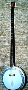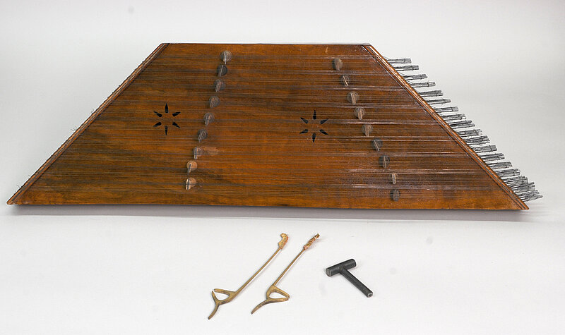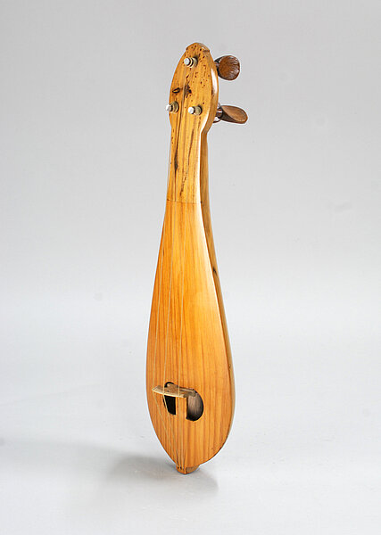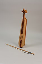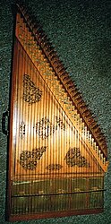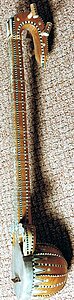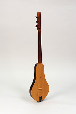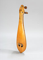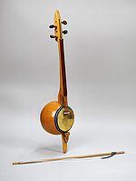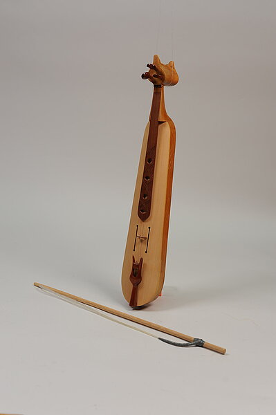 Ende des vorigen Jahrhunderts wurde die dreisaitige Form durch eine viersaitige mit Stahlsaiten ersetzt, wie das nebenstehene Foto zeigt. Auch diese Variante besitzt kein Griffbrett.[294][295]