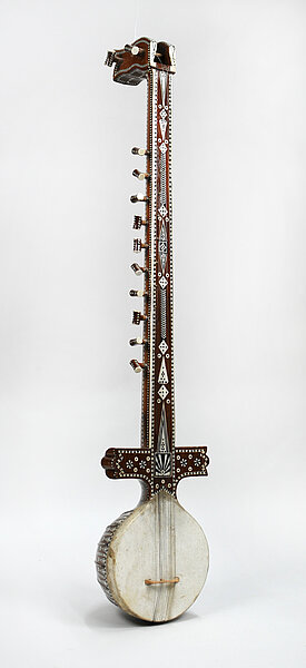 Die Uiguren haben eine Reihe von Musikinstrumenten entwickelt, die sich vor allem durch ihre reiche Verzierung mit meist typischen geometrischen Ornamenten aus Horn und Knochenmaterial auszeichnen. Sie finden in den Orchestern des Muqam Verwendung aber auch in den übrigen Formen der volkstümlichen Musik.[225]