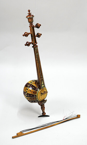 Die Khushtar klingt vor allem wegen der Holzdecke tiefer und weicher als die fellbespannte Ghijak und ist in letzter Zeit eines der wichtigsten Melodieinstrumente professioneller Muqamensembles geworden. Es gibt sie in verschiedenen Stimmlagen, bei dem abgebildeten Instrument handelt es sich wohl um ein Sopraninstrument.[225]