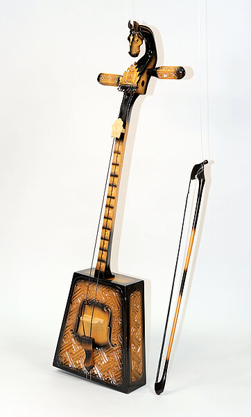 Das nebenstehende Instrument ist aus einem Stück herausgearbeitet, man verwendet dazu oft Kiefern- oder Lärchenholz. Die Decke wurde traditionell aus Kamel- oder Ziegenfell hergestellt, sie enthält drei kleine, runde Schalllöcher. Die beiden Saiten sind unterständig befestigt und verlaufen über einen niedrigen Steg, der auf dem Fell des Resonators aufsitzt. Gestimmt werden sie meist in Quarten ( gelegentlich auch in Quinten) mit zwei einfachen Holzwirbeln, die nur auf der einen Seite des bundlosen Halses sitzen. Die Saiten waren früher aus Pferdehaaren zusammengedreht. Bei der einen war die Drehung im Uhrzeigersinn, bei der anderen im Gegensinn. Der Kopf des Instruments ist immer verziert, in diesem Fall ist es ein Pferdekopf. Üblich ist auch die Darstellung eines Schwans, weshalb manchmal auch von einer Schwanenhalslaute gesprochen wird.Gespielt wird nicht mit einem Plektrum sondern mit verschiedenen Fingertechniken der rechten Hand.