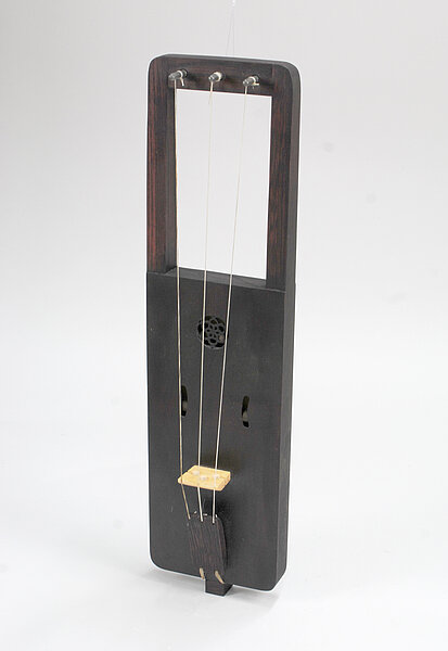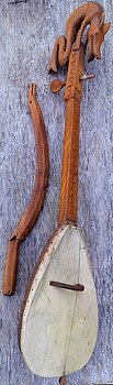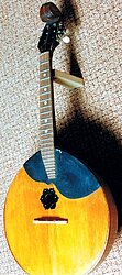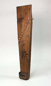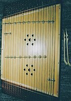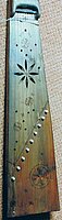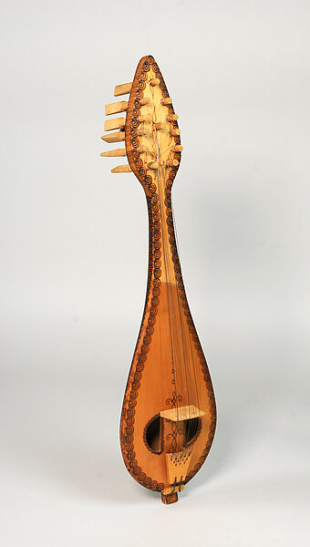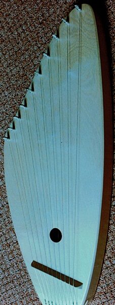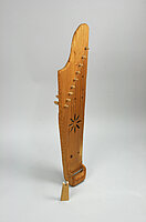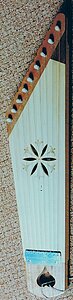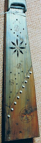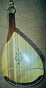 Das rechte, sehr einfache Instrument könnte man auch als Scheitholt ansehen (siehe Kap. Mitteleuropa); es hat zwei Reihen von Melodiesaiten, die oberste dreichörig, die zweite zweichörig, daneben verlaufen drei Bordunsaiten. Die erste Reihe ist wahrscheinlich diatonisch angeordnet, die zweite enthält die Halbtöne. Die Begleitsaiten werden normalerweise auf den Grundton sowie eine Quarte höher und eine Quinte tiefer eingestimmt.