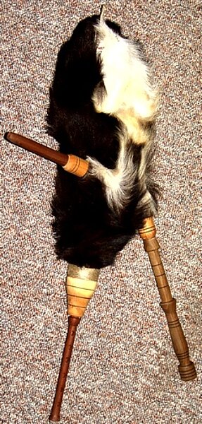 Sackpfeifen (Dudelsäcke) sind in Europa von Portugal bis zum Ural verbreitet. Auch in fast allen ost- und südosteuropäischen Ländern sind Abarten dieses Instruments mit unterschiedlichen Bezeichnungen vertreten. So heißen sie in Estland torupill, in Karelien pilai, in Lettland, Litauen und Weißrussland duda, in Polen kozol, in der Ukraine kosa, in Tschechien dudy, in der Slowakei gajdy, in Bosnien diple oder diplice, in Ungarn duda, im Banat dvonjci, in Mazedonien und Albanien gajde und in Bulgarien gaida. Die hier abgebildete Sackpfeife hat mir ein rumänischer Freund aus seiner Heimat mitgebracht, wo man es cimpoi nennt, aber auch die Begriffe  cempoi, cimponi, ciumpoi, simponi, chimpoi können dafür verwendet werden. In Teilen Rumäniens, in  Moldawien und dem Banat kann sie auch nach dem Namen der Spielpfeife caraba´genannt werden. Die östlichen Sackpfeifen weisen mit wenigen Ausnahmen, wie z.B. der bulgarischen gaida, als Merkmal Einzelrohrblätter auf, die etwas weicher klingen als ihre westeuropäischen Verwandten mit den oboeähnlichen Doppelrohrblättern.
