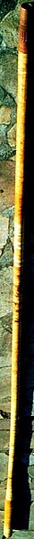 Das rechts abgebildete Instrument wurde von seinem Verkäufer aus der Ukraine als rih bezeichnet. In der mir zur Verfügung stehenden Quelle [633] lautet eine andere Bezeichnung dafür rischok. Dabei soll es sich aber um ein gekrümmtes Rinderhorn handeln. Wahrscheinlicher stellt das Bild eine truba dar, die in dem Artikel als ein bis zu 2 m langes, konisches Holzrohr beschrieben wird. Sie wird im Nordwesten der Ukraine ähnlich wie die trembita bei Beerdigungszeremonien eingesetzt. Sie stellt gewissermaßen eine verkleinerte Form der trembita dar.