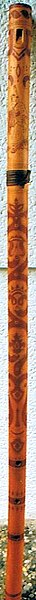 Die heutige fujara ist 165 bis 180 cm lang bei einem Außendurchmesser von 3 - 5 cm und einem Innendurchmesser von 2,5 - 3,5 cm.. Die Innenbohrung ist immer leicht konisch. Im unteren Teil befinden sich drei Grifflöcher, die meist den gleichen Abstand voneinander haben. Angeblasen wird die Flöte durch ein 50 - 70 cm langes Anblasrohr aus Holz, das mit Lederriemen fest mit dem Hauptrohr verbunden ist. Über einen kleinen, hölzernen Anblasnippel wird die Luft in das Anblasrohr geleitet.. In dessen oberem Teil befindet sich zwischen beiden Rohren ein ebenfalls hölzernes, hohles Verbindungsstück, welches die Luft direkt in die Kernspalte leitet. Diese sowie der Aufschnitt mit der Labiumkante befinden sich auf der Grifflochseite des Instruments, dem Spieler abgewendet. Es sprechen nur die Obertöne an. " Die fujara - Melodien sind mixolydisch, und ihr melancholisch-bukolischer, rhapsodischer und pathetischer ..... Charakter ist, wie schon gesagt, den Räuberliedern verwandt, womit sie in den letzten 100 Jahren einen wesentlichen Einfluß auf die slowakische Kunstmusik hatten" [636]